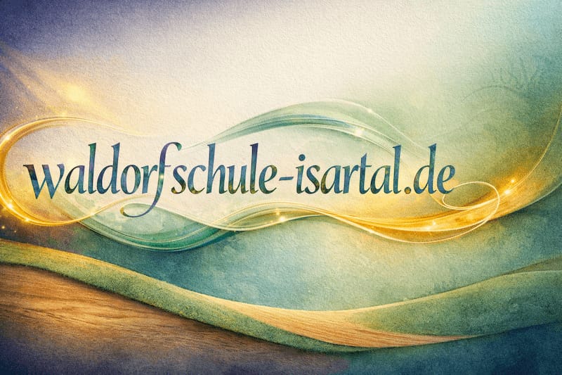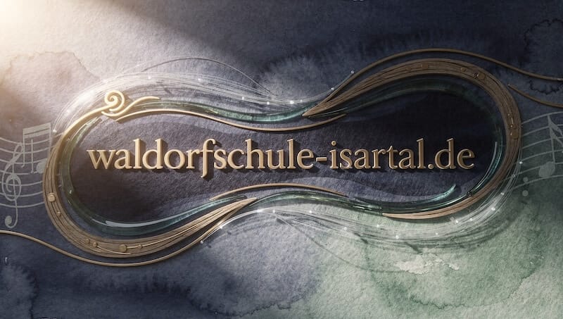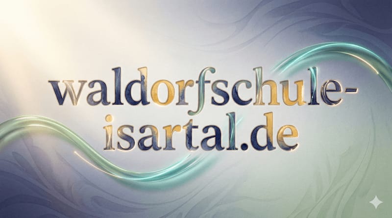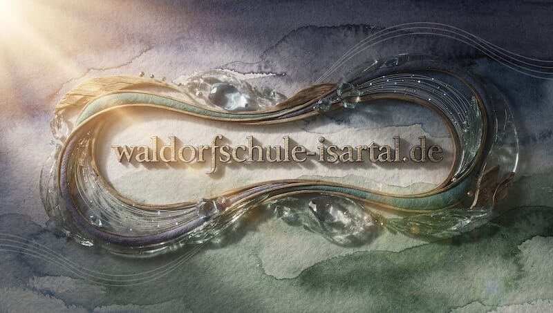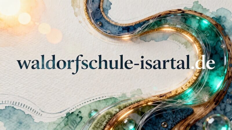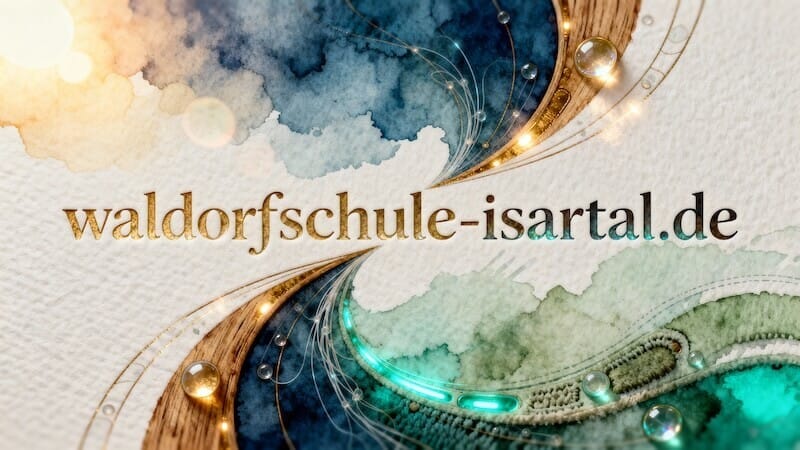 “waldorfschule-isartal.de” — premium typographic hero image, horizontal 16:9 keynote banner, ultra-high-resolution. Style: organic futurism × ethereal solarpunk with Waldorf eurythmy flow; no hard 90° angles. Typography: elegant custom serif–sans hybrid with gentle calligraphic curves, refined ligatures, soft brush edges; letterforms subtly composed of wet-on-wet watercolor pigment interlaced with translucent glass and fine fiber-optic strands; tasteful emboss/deboss, micro-texture fidelity. Textures & materials: tactile watercolor wash, raw wood grain and felt inlays, smooth glass highlights. Lighting & color: warm, volumetric sunlight from left with soft bloom; intelligent, low-intensity digital glow tracing the curves; palette of deep anthroposophic indigo, warm beeswax gold (#F2C94C) accents, living sage green (#7D9D74) undertones, luminous teal accent; harmonious, soulful, educational, visionary mood. Perspective & composition: front-on, eye-level, centered URL; flowing eurythmic S-curves guiding the eye; generous negative space; title-safe margins (~10%); no clutter. Background: clean, tactile paper grain with a subtle indigo-to-sage gradient and faint rhythmic motifs; no distracting elements. Enhancements: cinematic composition, high dynamic range, crisp yet soft edges, gentle bokeh, glass refractions/caustics, ray-traced specularity, print-grade sharpness. Technical: 16:9 (≥3840×2160), 300 DPI export, high fidelity, artifact-free. Negative prompts: no harsh neon, no dystopian vibes, no metallic chrome, no busy patterns, no extra text, no pixelation, no watermark, no low-res.