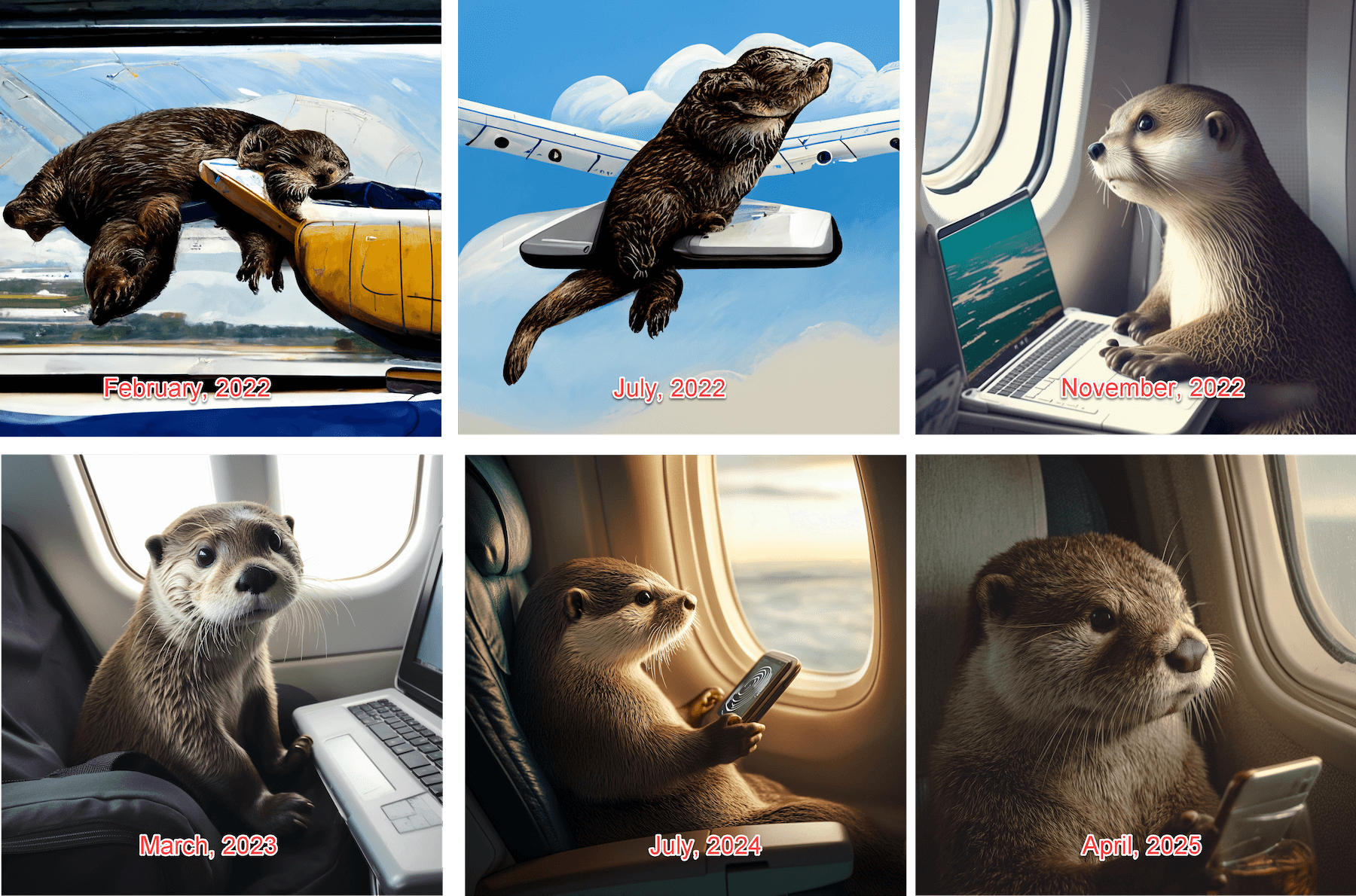 Ethan Mollick ist einer der inspirierendsten US Professoren, die keine IT-Profis sind und sich mit Business und Strategie Fokus mit KI beschäftigt. Er liebt Otter und prompted bei jedem neuen Grafik-KI-Modell: “Otter, der in einem Flugzeug reist.”